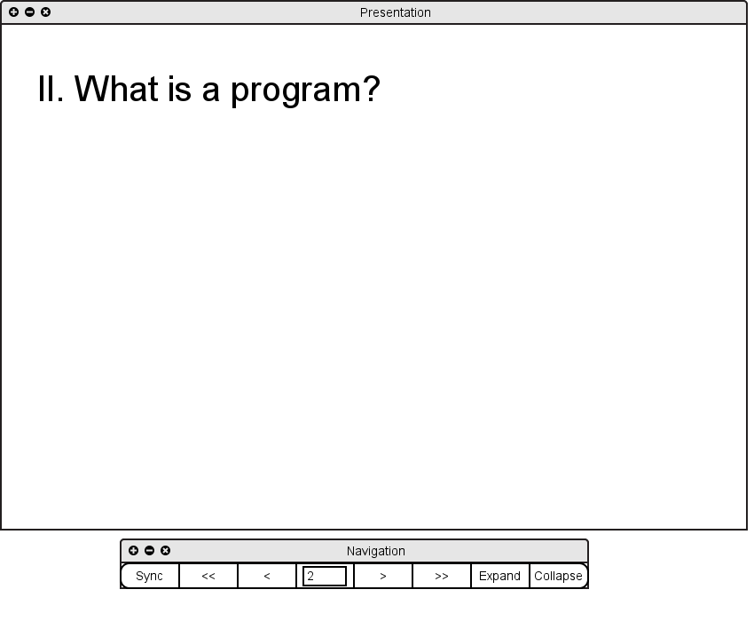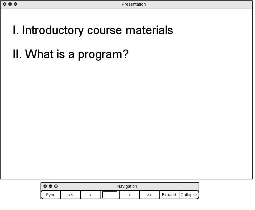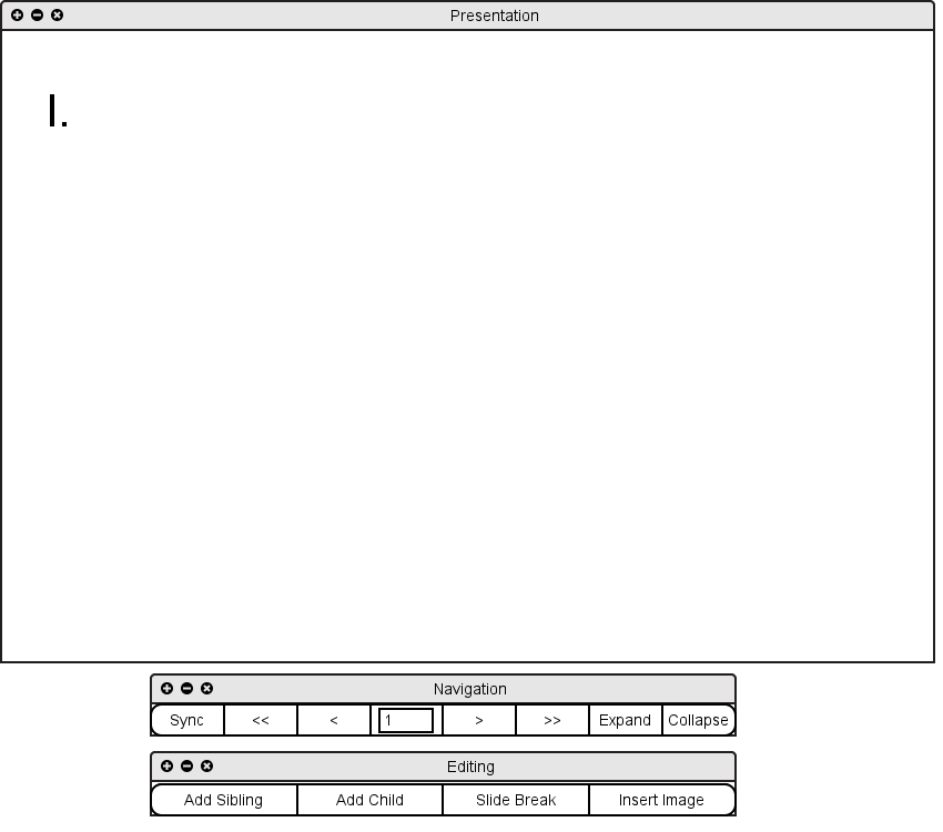 To create a new presentation "from scratch", the instructor selects the 'File > New' menu item. This opens a new presentation window, with one initial topic, as shown in Figure 2.2.1.1. A presentation document is also immediately available upon opening E-Class.