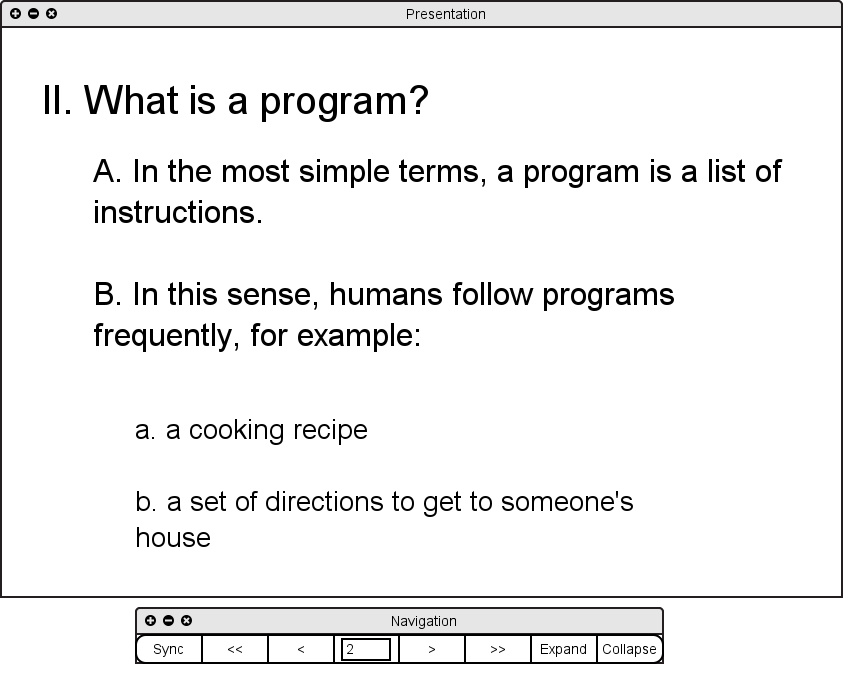Figure 2.2.1.4 shows the result of the instructor having used the 'Add Child' and 'Add Sibling' commands several times to create a hierarchy of topics on the second slide.