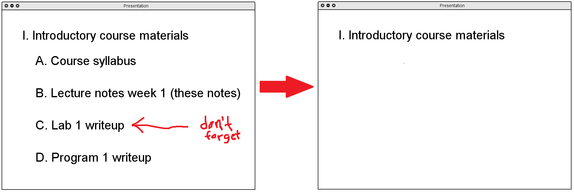 Similar to the expansion of presentation topics, the instructor may "collapse" material that is no longer useful for the discussions at hand using the minus button next to the section. When the user presses this button, the subtopics disappear and the minus button turns to a plus button. For example, in Figure 2.4.3.2 below, collapsing "Introductory Course Materials" would hide the "Course syllabus", "Lecture notes week 1", "Lab 1 writeup", and "Program 1 writeup" subsections.