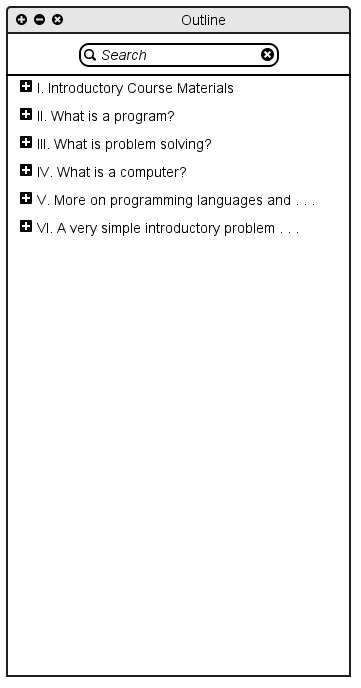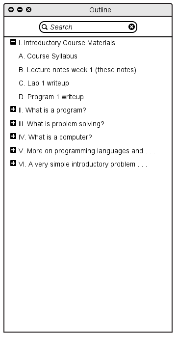 In navigating through a presentation outline, the instructor has the ability expand and collapse different topics in the outline, to show or hide relevant (or irrelevant) material. To expand a section of content, the user has the ability to click the plus button to the left of the section. When the user presses this button, that portion of the outline will "expand" and reveal the subsection headers in the next level down. For example, in Figure 2.4.3.1 below, the instructor has pressed the expand button next to "Introductory Course Materials" to show the "Course syllabus", "Lecture notes week 1", "Lab 1 writeup", and "Program 1 writeup" components that reside beneath it.