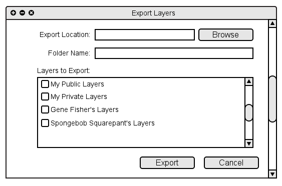 Often times a user may want to export all the layers that were viewed during a presentation. This function is available by going to "File > Export". When the user chooses this menu option, the export dialog appears, as seen in Figure 2.4.4.1. In its initial state, all boxes are unchecked and fields are empty.
