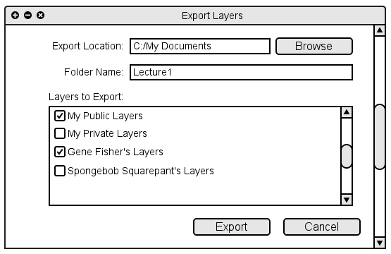 In continuing with our example from the previous subsections, suppose the presentation has just ended and the student wants to export their public layers and the teachers layers associated with this presentation. They click the check boxes next to "My Public Layers" and "Gene Fisher's Layers". This example is shown in Figure 2.4.4.2.