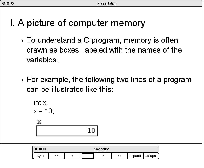 The HTML <ol> and <ul> list structures are used to mark up the outline of the presentation, with each <li> element corresponding to a topic, and nested <ol> and <ul> elements corresponding to sub-topic lists. Topics within <ol> elements will be labeled with numbers or letters depending on their depth: Roman numerals (I, II, III) at the top level of topics, followed by capital letters (A, B, C), Arabic numerals (1, 2, 3), and lowercase letters (a, b, c). Topics within <ul> elements will not be numbered; when they appear as sub-topics on a slide, they will be bulleted.