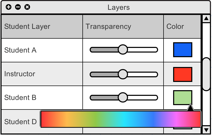 Using the layers window (shown in the previous subsection), the instructor can reorder students' layers, change their transparency, or change default annotation colors (helpful for distinguishing separate students' work).