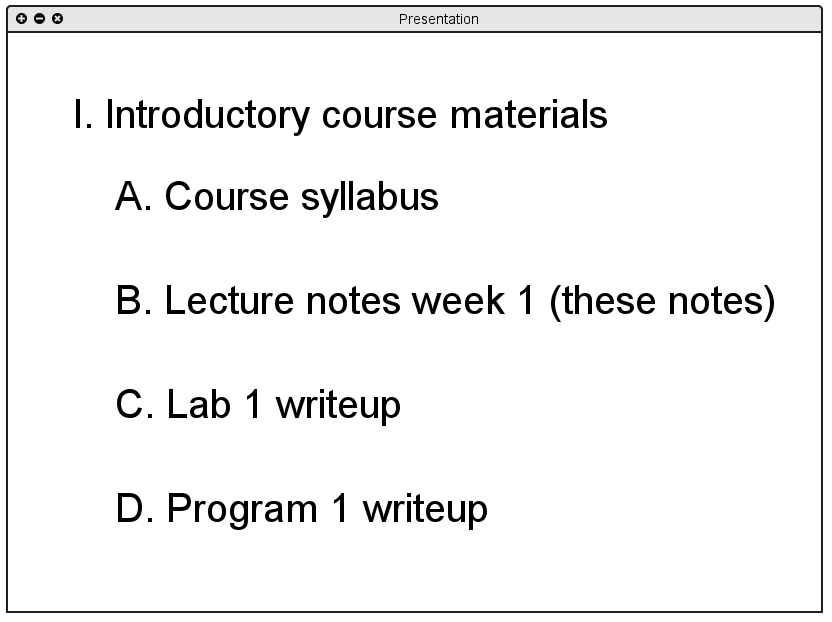 Another tool the instructor has to move between topics is the outline. When the user clicks a section header or subsection in the outline window (shown in Figure 2.4.1.4), the presentation window navigates to the first associated slide. Particularly, if the lecture is in a looser format or if someone brings up previous or upcoming information for discussion, using the outline to make large jumps between big-picture material is useful; the outline makes moving between distinct ideas and showing the hierarchical relations between them easier and more efficient.
