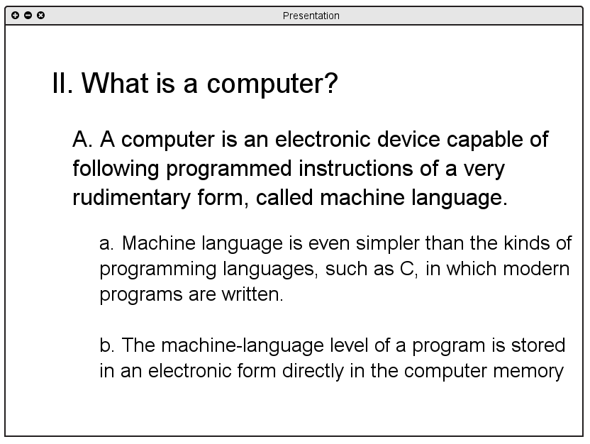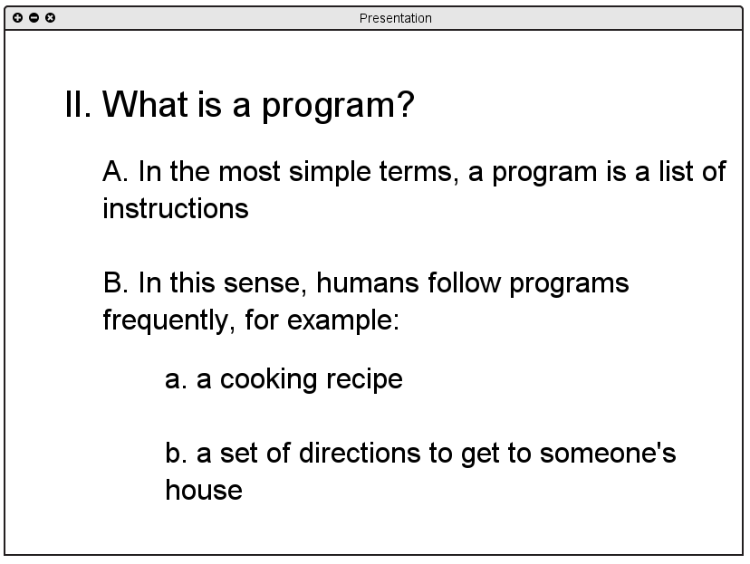 For example, if the instructor is viewing the presentation above (Figure 2.4.1.2), pressing the "Next" button advances the presentation to the first slide associated with topic II, "What is a program?". The result of this action is shown below, in Figure 2.4.1.3.
