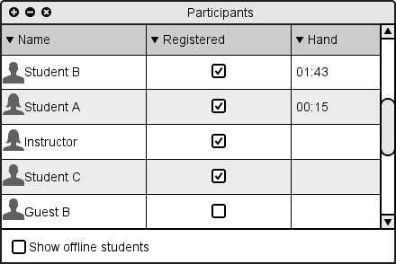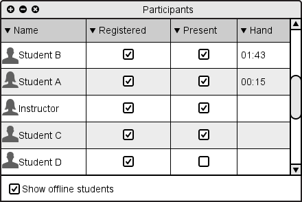 The students are then sorted by default first by how long their hand has been raised, then by whether or not they are registered, and lastly by the alphabetic order of their names, as shown in Figure 2.6.5.3 above.