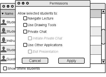 To set permissions on a user in the Participants Window, the instructor right-clicks on the user and then selects "Permissions...". This brings up the a Permissions window, as shown in Figure 2.6.3.1.