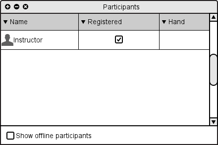 When a presentation session is started, the Participants Window opens. By default, the Participants Window has three columns: the name of the user, a non-modifiable checkbox indicating whether the user is registered or an anonymous guest, and a non-modifyiable text display showing how long a partcipant has had their hand raised. Figure 2.6.1 shows the participants window just the presentation session is started, before students have joined.