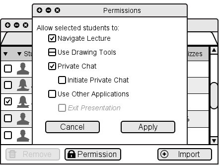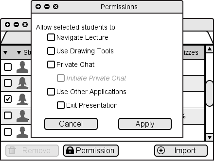 The Permissions Window's Cancel button closes the dialog, making no changes to student permissions. The Apply button changes the permissions of the selected student(s) but does not close the dialog.