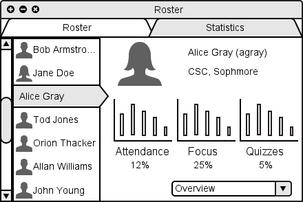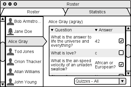 To view student statistics, the instructor opens the class roster window and selects the Statistics tab. This brigns a list of students in the left side of the screen. Clicking on a student in this list brings the selected student's statistics into view on the right side of the window, as shown in Figure 2.7.3.1.
