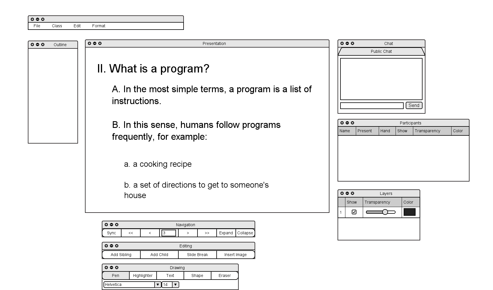 Next, the instructor chooses 'Class > Start Presentation' to start a session to which students can connect involving the active presentation, drawing and other interactive functionality. The user interface then appears as shown in Figure 2.2.3.2.