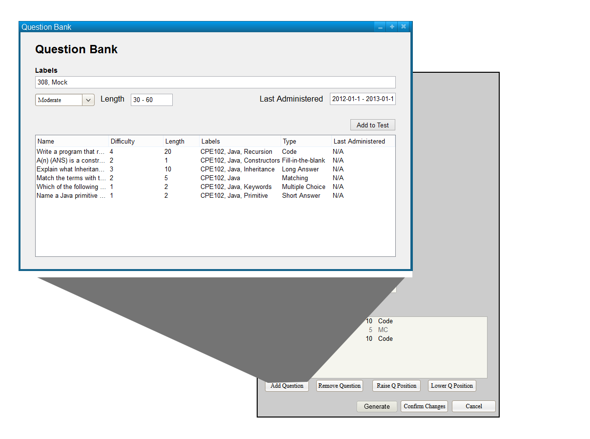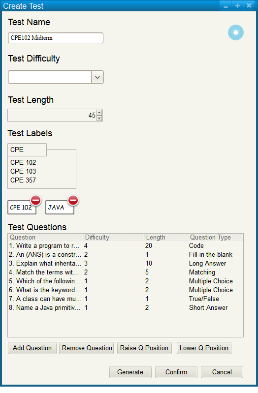 The user may raise and lower question positions using the raise question and lower question buttons, respectively.