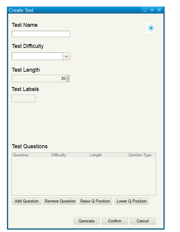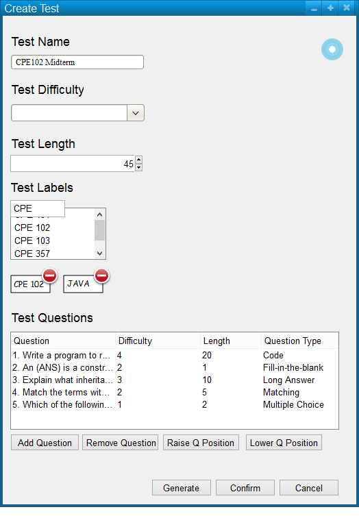 The user then clicks generate, which will automatically populate the list of test questions based on the parameters entered