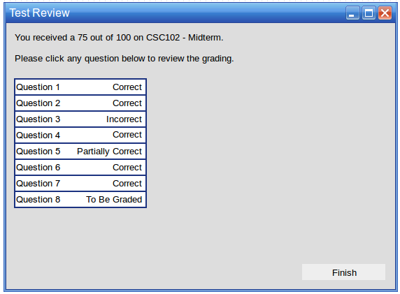 After clicking the Submit button at the end of a test review for a test that is automatically graded, the user may review the graded test results. All questions are shown graded as either Correct, Incorrect, Partially Correct, or To Be Graded. To Be Graded means that the question requires instructor action before its final grade is determined.
