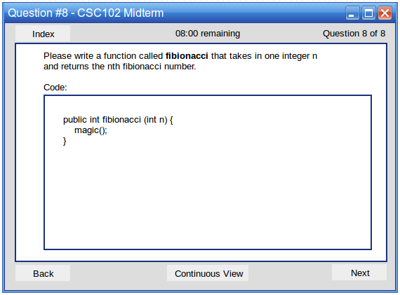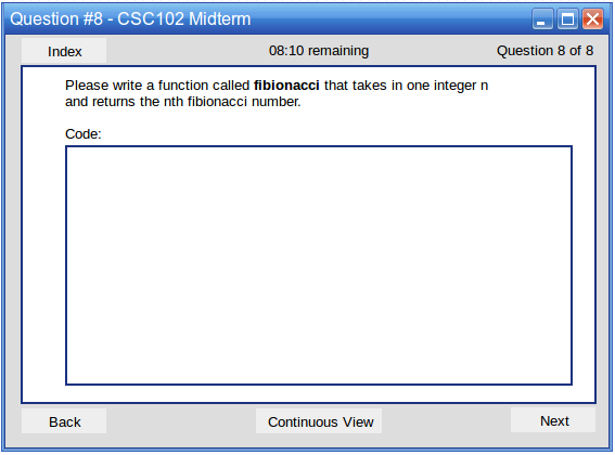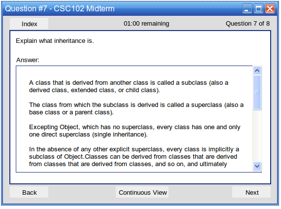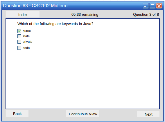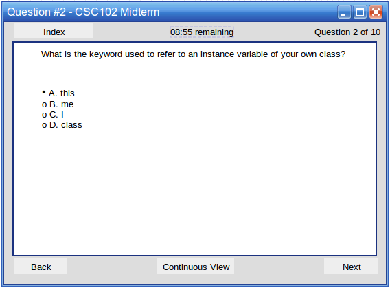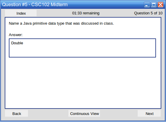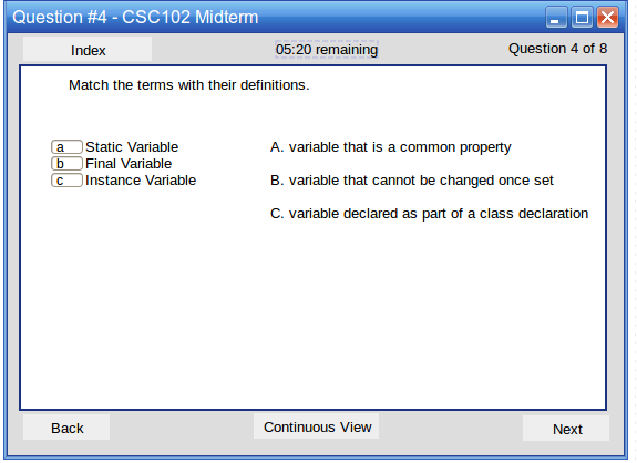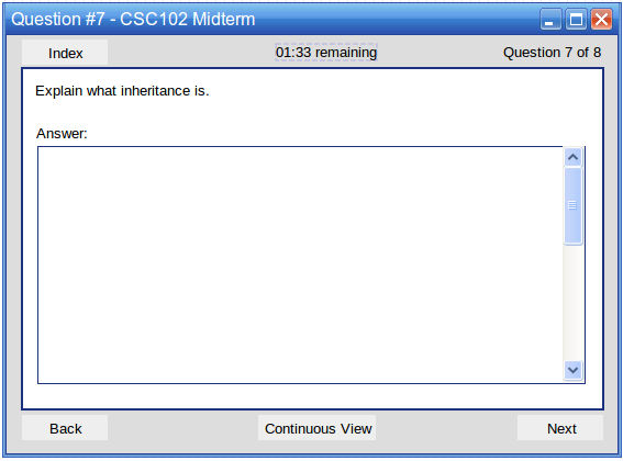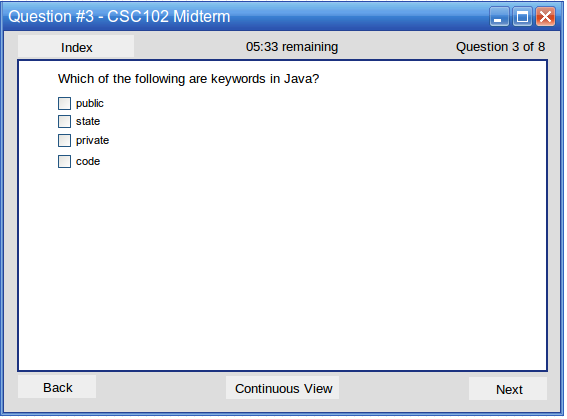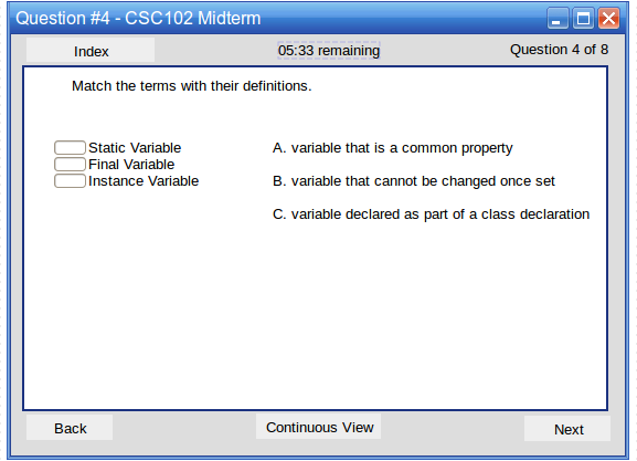 The Index button takes the user to the Test Review which will allow the user to jump between questions in the test and see their current statuses. The Test Review is elaborated on in 2.4.3.