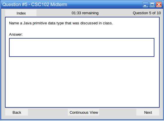 The figure's title bar shows the current question number. Under the title bar, the system displays two labels and one button. The label in the middle of the window shows the amount of time remaining. The right label shows the current question and the total number of questions in the test.
