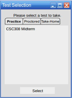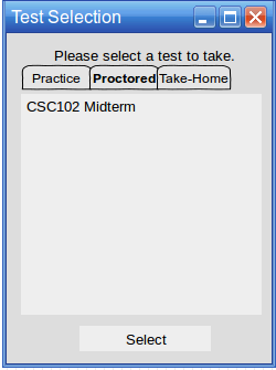 The user may choose from a list of currently available tests in a list. To take a test, the user must select a test and click the Select button.