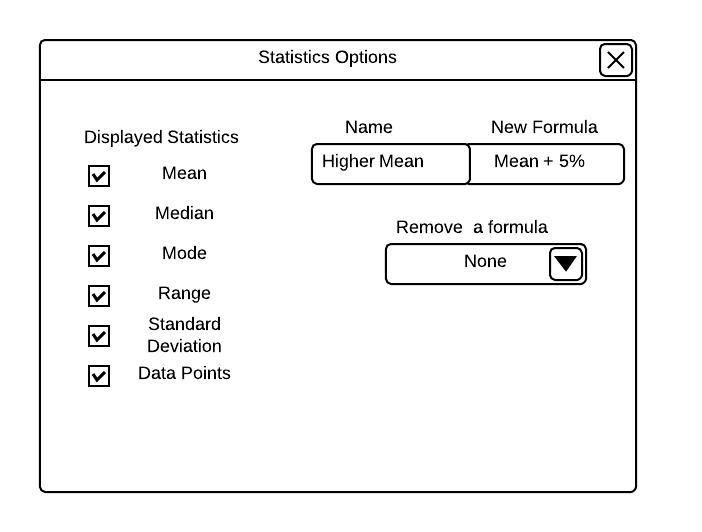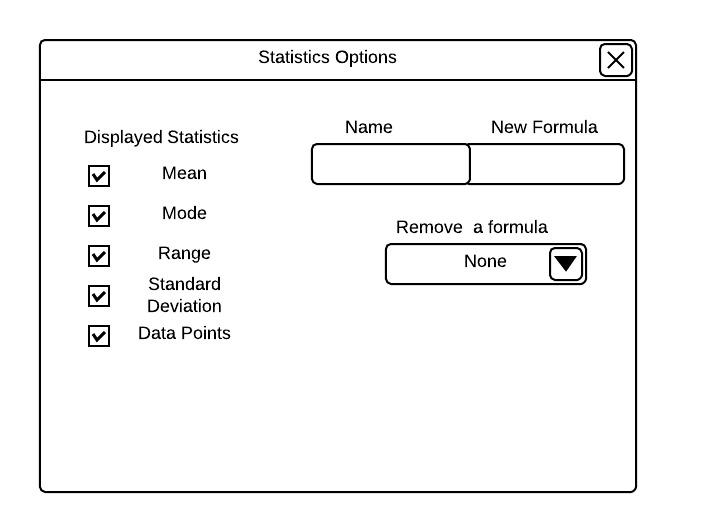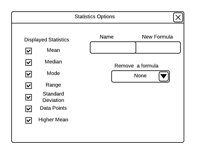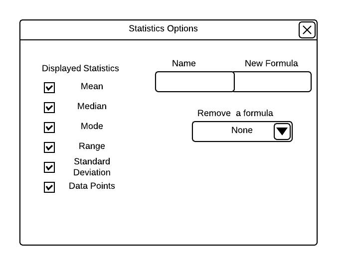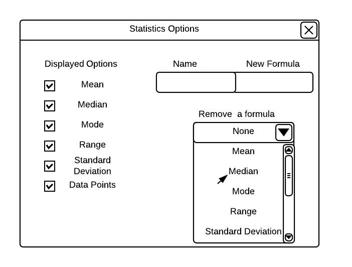 From the option menu the user may also add new formulas. The user adds a new formula by typing a name in the box under 'Name' followed by the new formula into the box under 'New Formula' followed by the key "enter". The name must be at least one character long, no longer than forty characters, and cannot match any preexisting names. Parameters for the formulas include the keywords: mean, median, mode, range, standard deviation, and data points as well as arithmetic operators and numbers. The formula must contain at least one parameter, no more than ten parameters, and each parameter must be separated by a space. Additionally, keywords and numbers must be separated by an operator. Formulas may only be added if there are less than ten existing formulas. displays a sample formula being added.