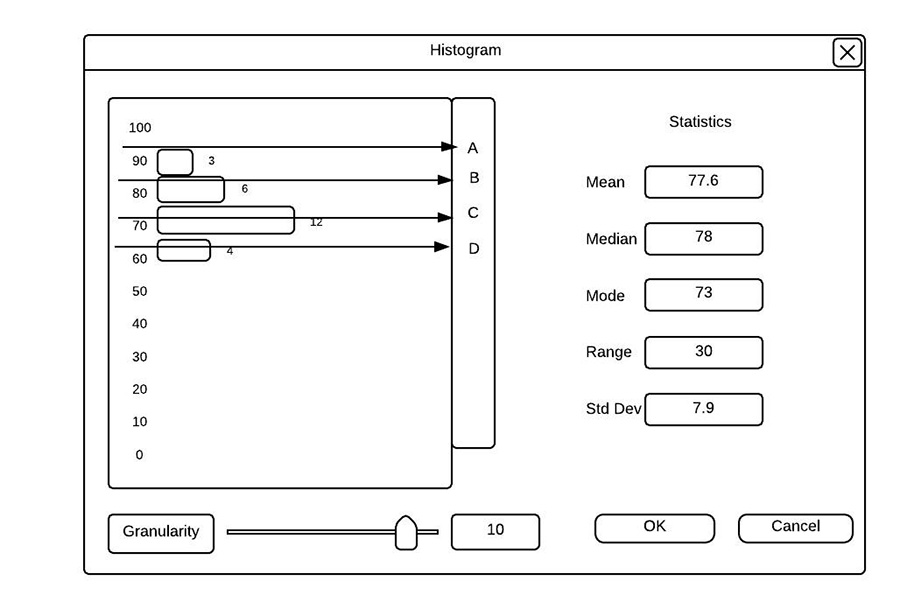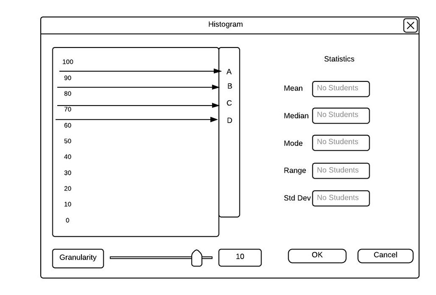 In response to clicking Tools on the main menu toolbar and then Histogram on the drop down menu, the system displays a window shown in , assuming there are no students added yet. To populate a class with students see Section 2.3.