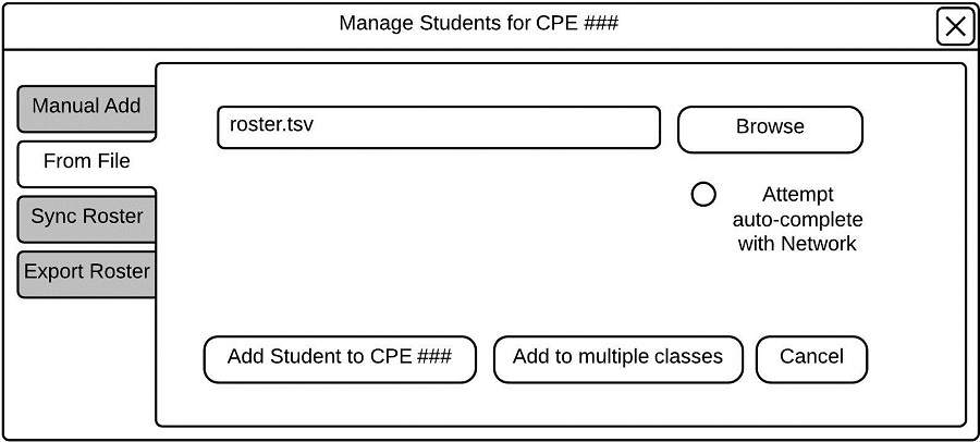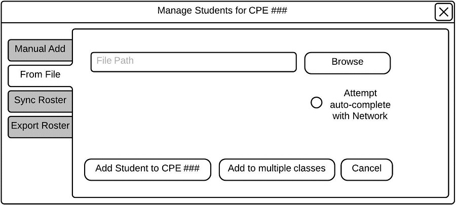 Student are added by supplying a file path and format as shown in in Figure 2.3.12. The instructor may elect to use the auto-complete feature, if it is available from a prior Network import.