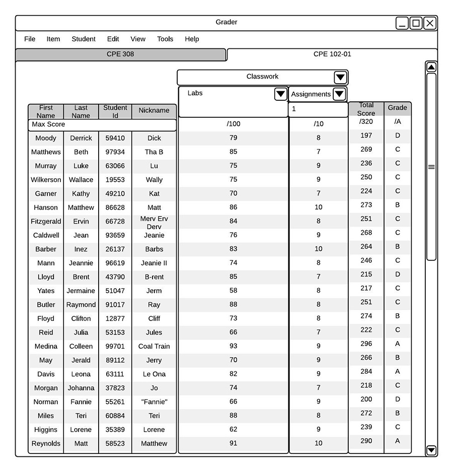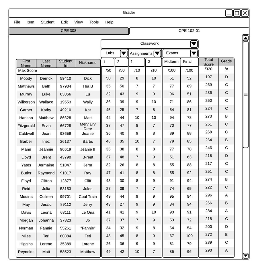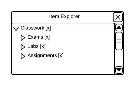 To hide an item, the user unchecks it. Checking or unchecking a item's box automatically checks or unchecks all of the item's sub-items. However, if all an item's sub-items are unchecked, the item itself will remain checked and will display total data calculated according to relative weights of its sub-items. For more information on the relationship between an item's data and its sub-items, please see section Section 2.4. shows a user having hidden all exams by unchecking the Exams item, hiding an Assignment individually, and hiding all individual Labs.