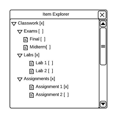 Instructors double-click any item name to launch the Item editor for that item. Non-instructors double-click any item name to launch a non-interactive view of the Item editor for that item. To display an item in the main view, the user checks the box on the right side of its name. indicates all items and sub-items are displayed in the main view as shown in .