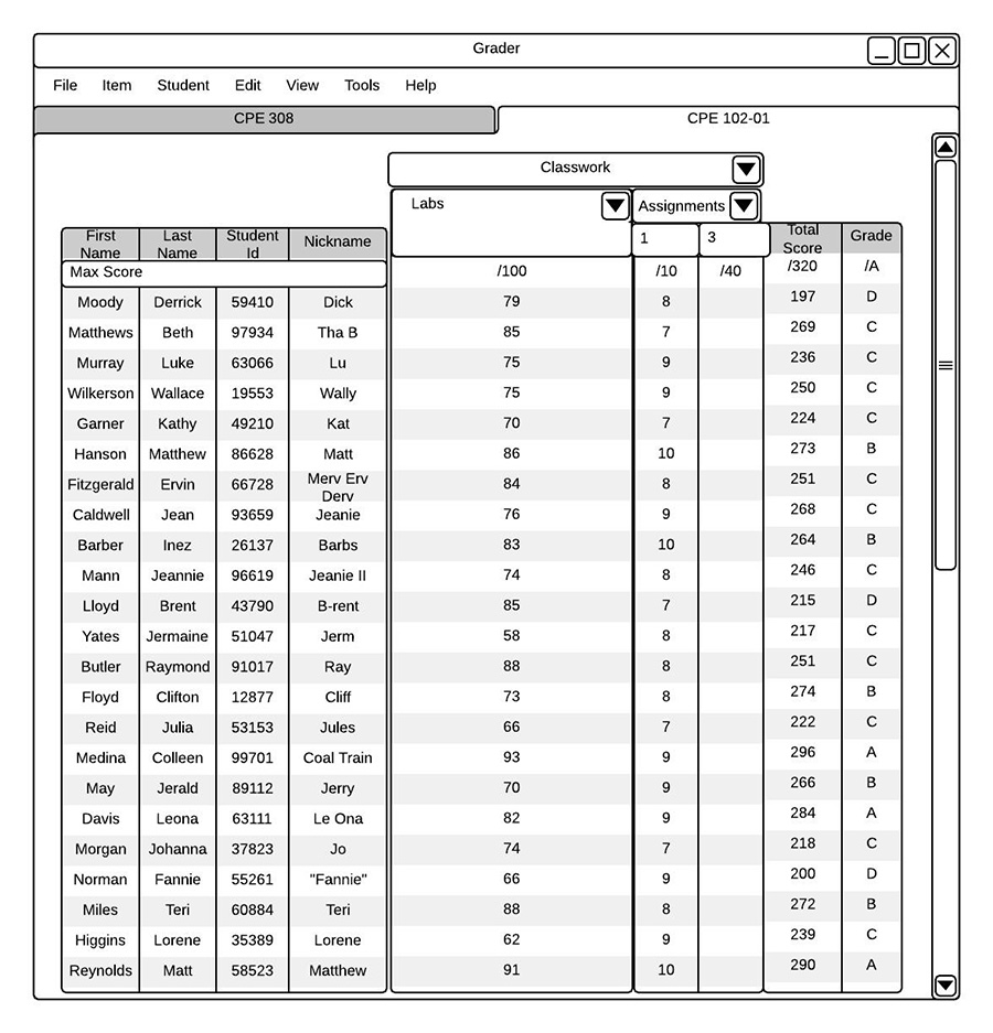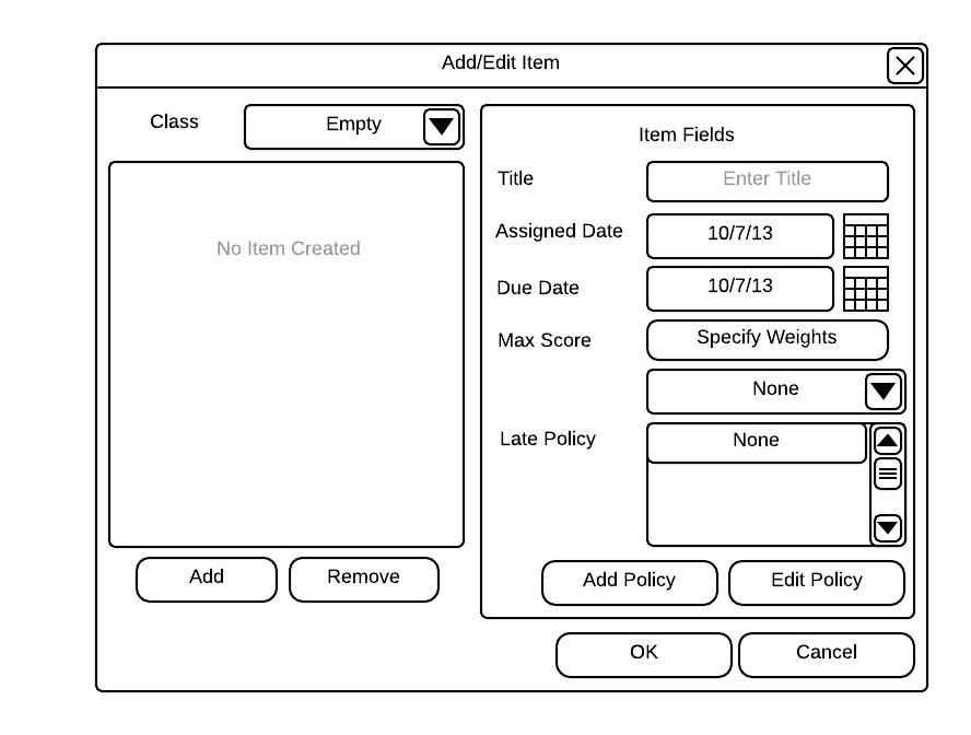 After creating a class, the instructor chooses to create an item. At this point the gradebook looks like Figure 2.2.12. The instructor chooses the 'Manage Item' in the Item menu command from Figure 2.1.2. In response, the system displays a dialog of the form shown in .