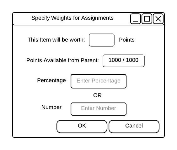 The very first time an instructor clicks the Specify Weights button for a category, it looks like . The first two lines of the dialog has two display fields. The first one tells the instructor the number of points the current item is worth and the second tells the instructor of the total points the parent item is worth. As noted before, every item created in the gradebook has the parent "Coursework" which has a specified number of points in the conditions of "Fixed and Divided" and "Fixed and Weighted" from the class-creation process. In the third case in which the gradebook is "Sum of Coursework", the instructor only specifies the number of points the item is worth (see ).
