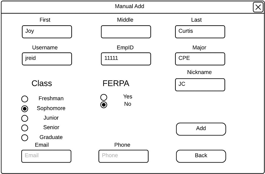 The instructor must fill in the first name, last name, username, EmpID, major, class, and major to be able to add a student to the roster. The instructor may optionally fill in the middle name, nickname, email or phone number of the student.