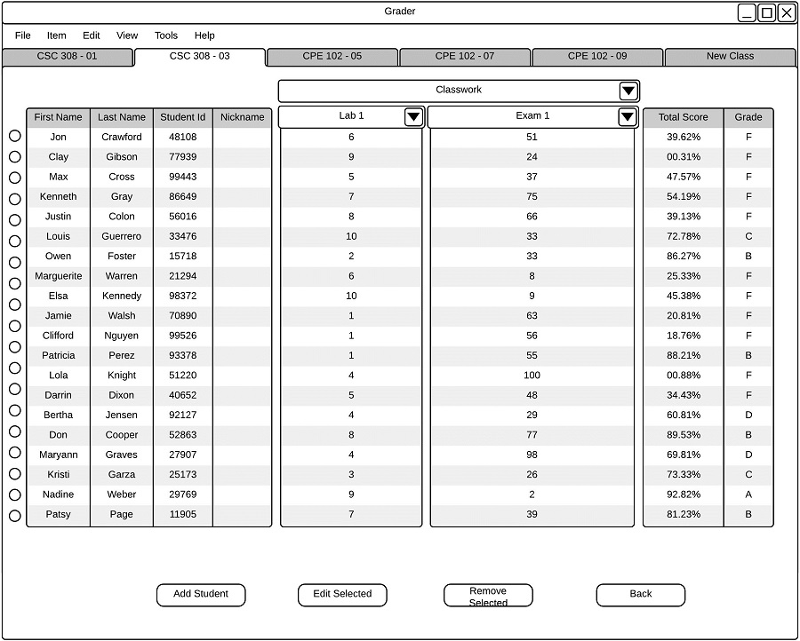 To manually remove a student, the instructor selects the radio option on the edit mode gradebook next to the student to be removed, and selects the 'Remove Selected' button. The student is then removed from the roster and the change is reflected in the gradebook view immediately.