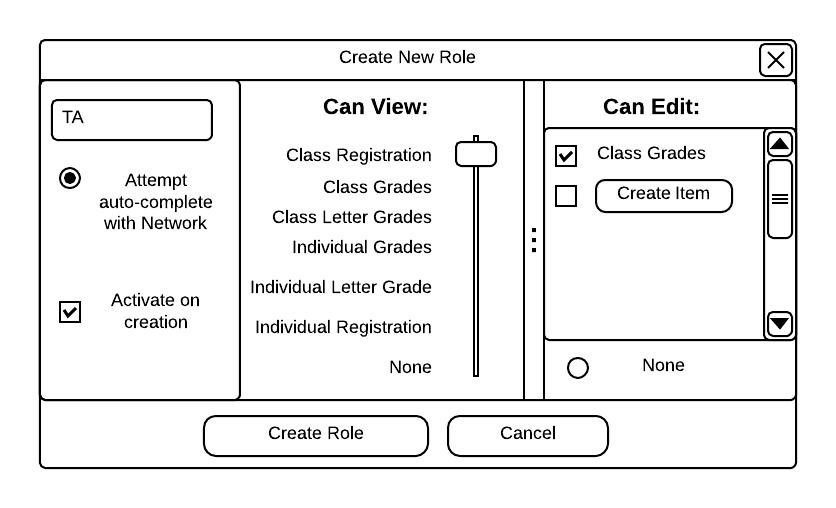 The instructor defines a role by specifying three aspects. First the instructor enters a non-empty free-form string in the role name field. Second, he or she specifies the role's viewing privilige with the "Can View" slider. Viewing priviliges include: