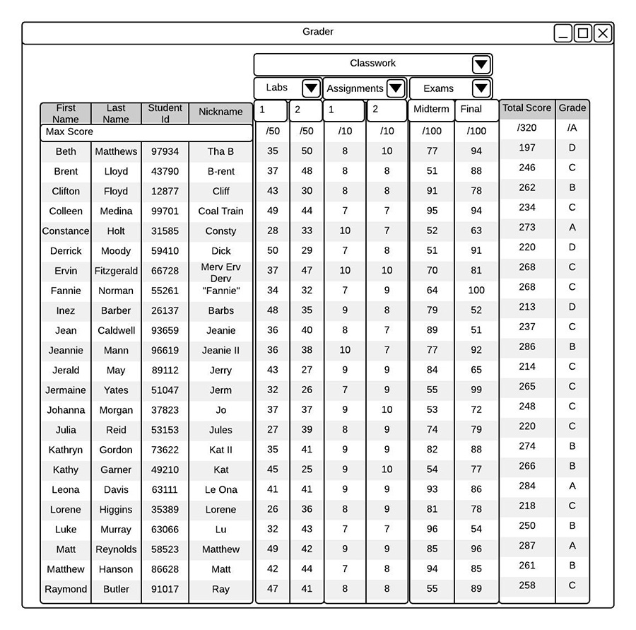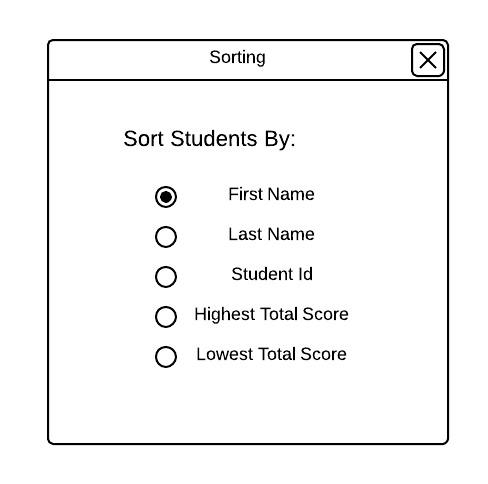 After selecting a button under 'Sort Students By...' the data in the table is updated. Only one option can be selected at a time. Figure 2.5.1 shows a sample class before being sorted. By default, students first appear in the order they were imported in. shows an example of a class sorted. In this example, the students are sorted in alphabetical order of 'First Name'.