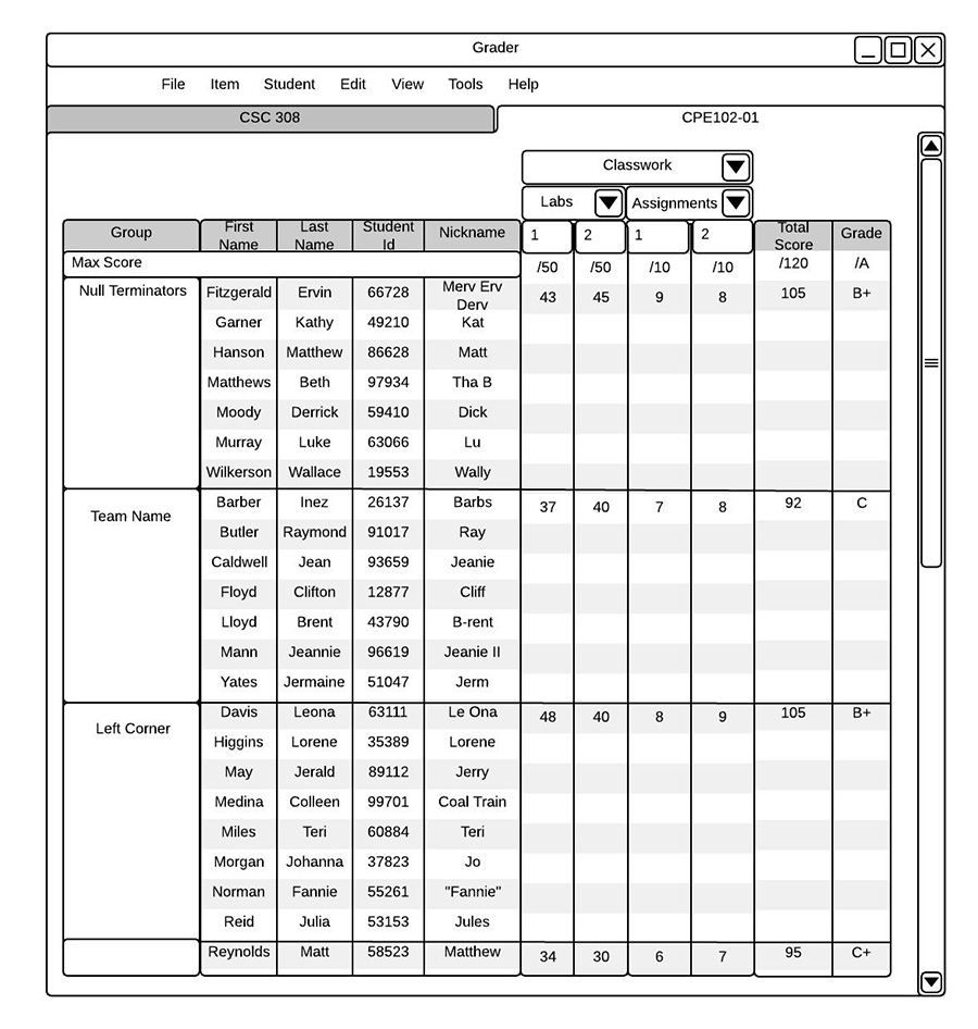 When the user is in group mode, students are sorted within their groups. Figure 2.5.5.3 shows an example class that is divided into groups that is sorted by 'First Name'.Sorted by 'First Name'