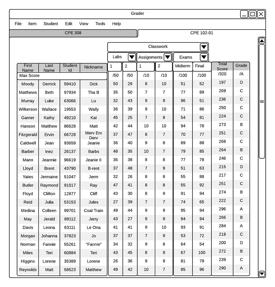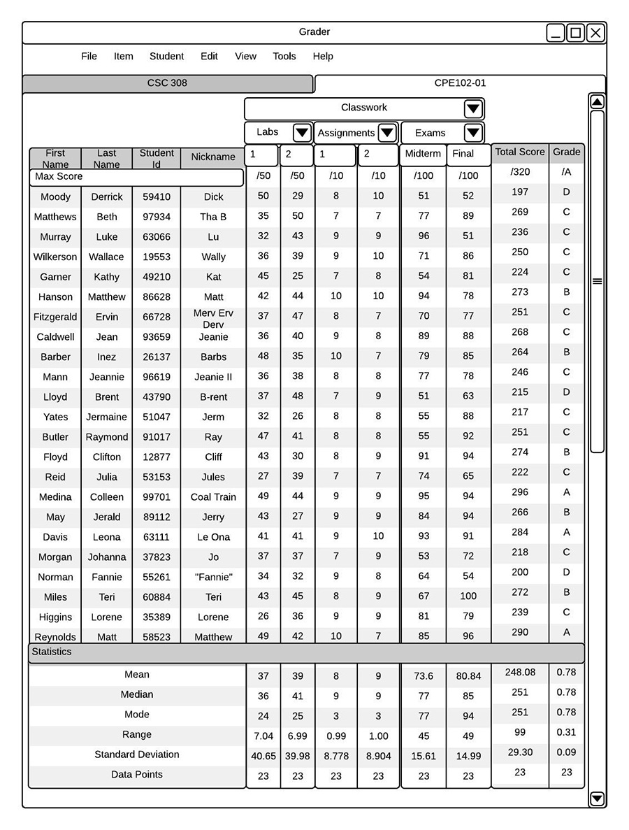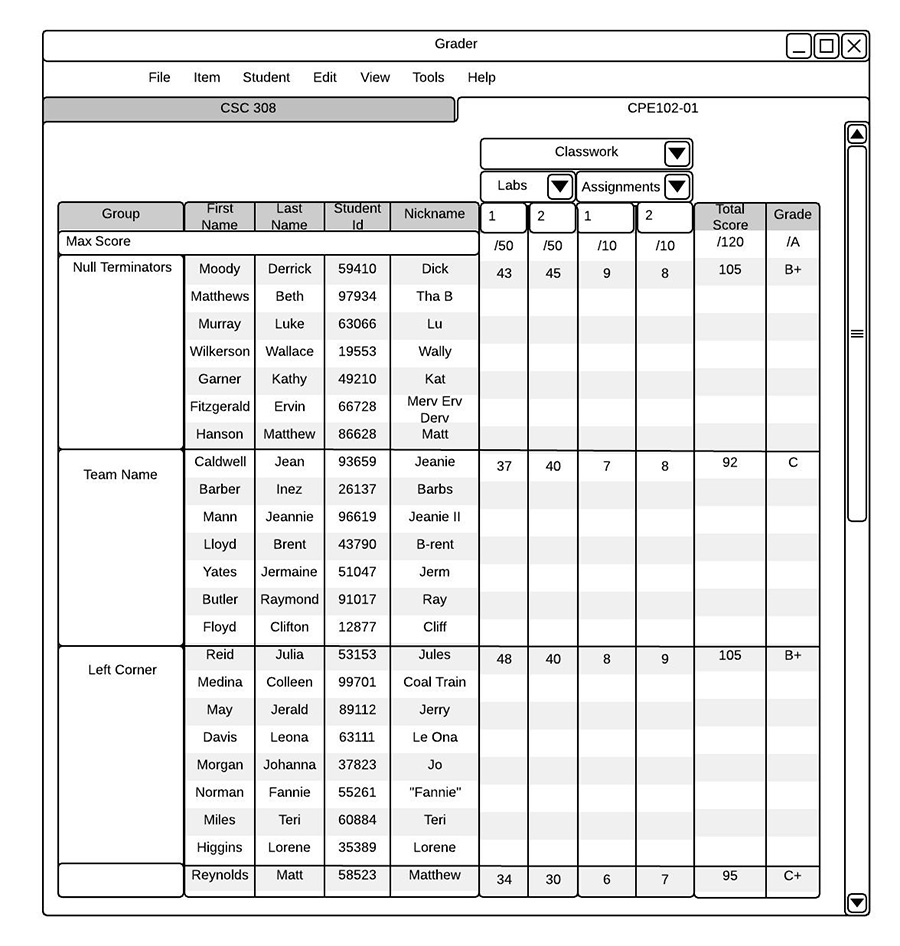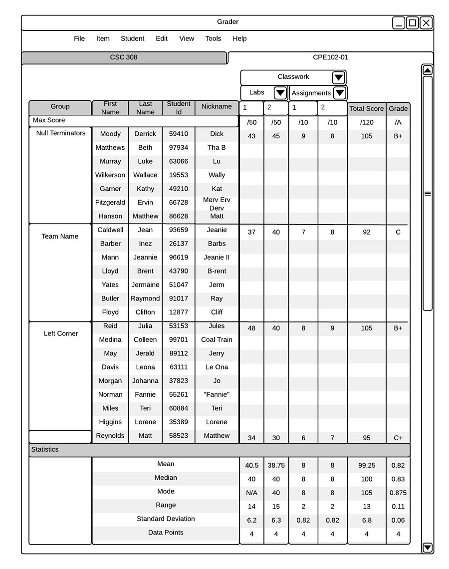 When the user selects the 'Groups' item in the 'View' menu command, as shown in Figure 2.1.2, the grade-book shows students' groups. shows a sample class that is divided into groups.