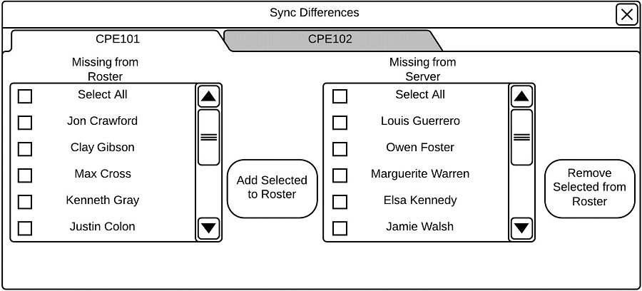 Students that are listed on the servers roster but missing from the local roster are listed in the box labeled 'Missing from Roster'. Students listed in the local roster but missing from the servers roster are listed in the box labeled 'Missing from Server'. From this dialog, the instructor chooses which students to add to the local roster and which to remove from the local roster by selecting students from 'Missing from Roster' and 'Missing from Server' and then selecting 'Missing from Server' and 'Missing from Server'.