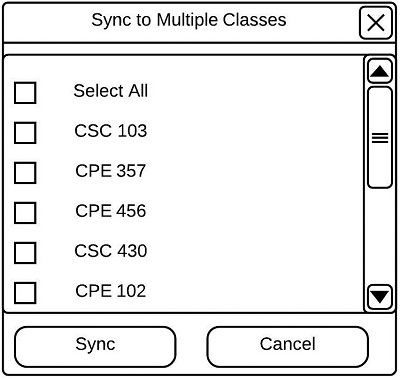 Next, the instructor must choose to synchronize the current class, or to synchronize multiple classes by clicking either the 'Sync current class' button, or 'Sync Multiple classes'.To synchronize multiple classes, the instructor selects 'Sync multiple classes'. The resulting dialog box is shown in