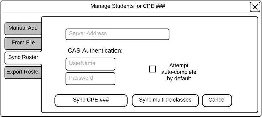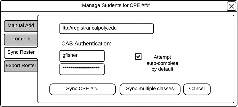 This scenario assumes that the instructor has already created a class. To Synchronize a roster, the instructor user selects the 'Sync Roster' tab from the 'Manage Students' dialog. The system displays a dialog of the form shown in .