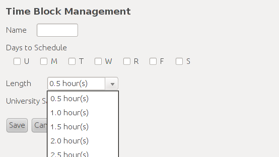 When a user reaches this screen he wouldn't need to use the name drop down menu since it's default value is "new Time Block" and there are no other Time Blocks to select. He could check "T", "W", and "S" to signify this Time Block will be for Tuesday, Wednesday, and Saturday. When he hits the length drop down box the following drop down menu will be shown as in Figure 2.
