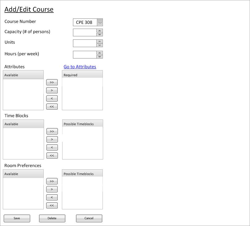The user proceeds to fill in the desired information. course number was CPE 308 and we'll set the capacity of the course to 25, number of units to 4, and number of hours per week to 4. The user also desided to add the Handicap Accessible attribute. Also required is the MWF 1 and TR 1.5 time blocks and two specific room preferences.