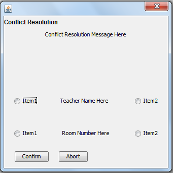 To resolve the conflict, the user chooses which items go with which teacher using the radio buttons.