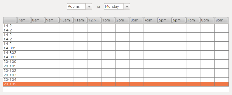 In the heading for this view are two drop down boxes. The first allows the user to select either Rooms or Teacher to focus on. The other shows which day of the week to be displayed.