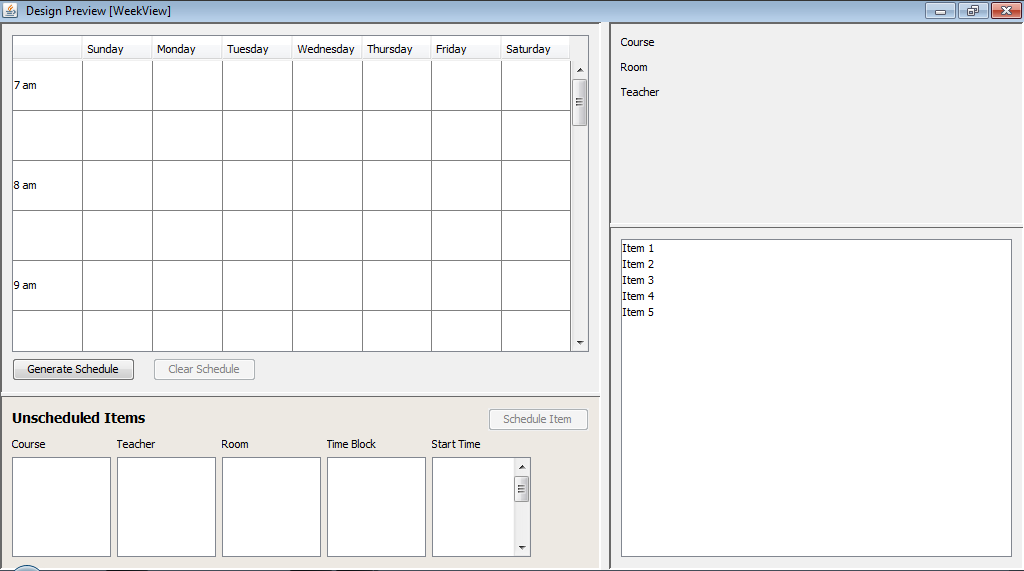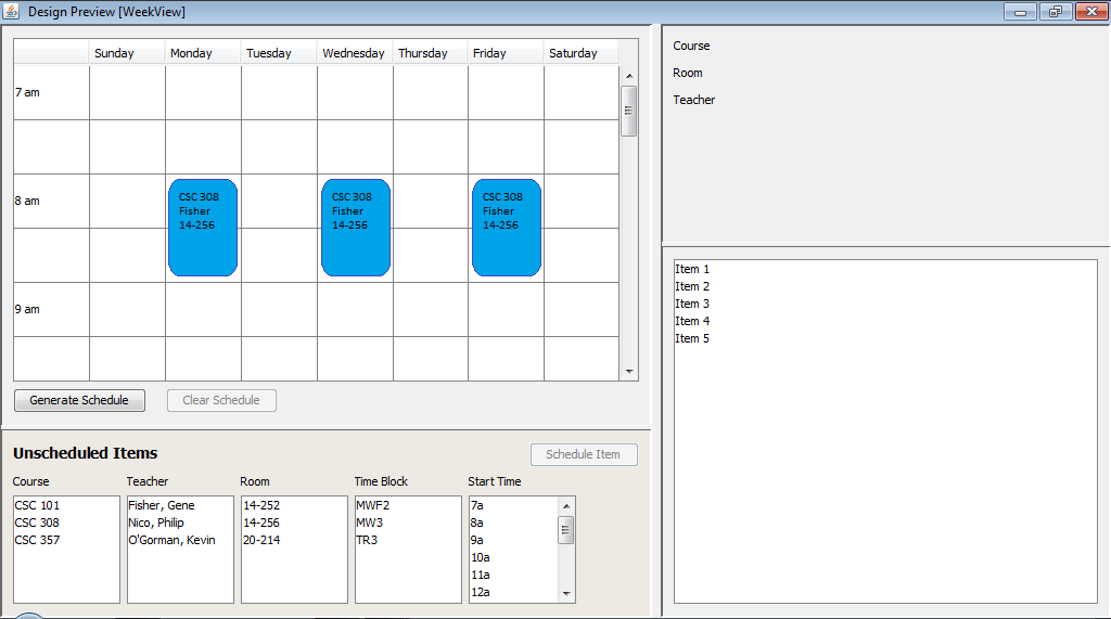To add an item to the schedule, the user selects a course, teacher, room, time block, and starting time from the list boxes. To add this item to the schedule, the user clicks the "Schedule Item" button. If adding this item will cause a conflict, the conflict resolution dialog is shown. See the conflict resolution page for more information.