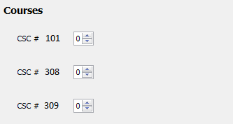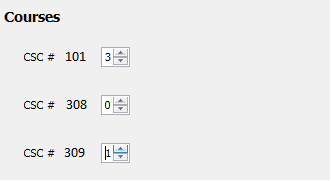 An administrative user chooses how many sections of each course are offered for a given term schedule. For the effect of a course not being offered during a term, the administrative user simply puts '0' for the amount of desired sections. Each course is set to zero sections by default. These course sections amounts are reflected on warnings during manual scheduling and are be properly scheduled during automatic scheduling. To create 3 sections of the first course, 0 sections of the second course, and 1 section of the last course the user adjusts the spinners or types into the text fields until the desired result is achieved, as shown below.