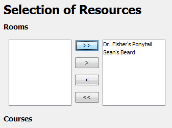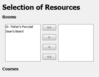 As shown above, no rooms are available for scheduling by default. The administrative user marks rooms available for scheduling by transferring the rooms to the list on the right side, as shown below.