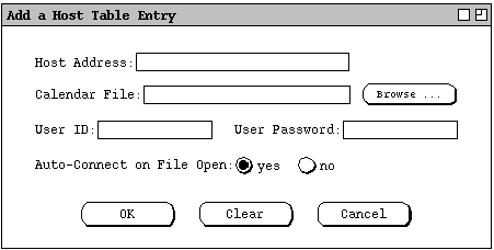 When the user presses the enabled `Save' button, the system saves the contents of the host table into the Calendar Tool Settings file. Only the host table portion of `Settings' is affected by this save, with all other portions of the settings file left unchanged. Details of Settings file contents and related commands are covered in Sections 2.8.1 and Unsaved changes can also be saved using the `Save Settings' command in the `File' menu, as described in Section .