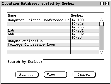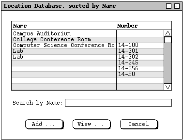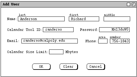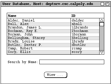 As shown in Figure 3, the default administrative interface consists of a menubar and a dialog for accessing the Calendar Tool user database. The same dialog is displayed when the administrator selects the `Users ...' item in the `Admin' menu. Figure 201 shows the state of the user database after a number of user records have been added.CSC 308 Midterm