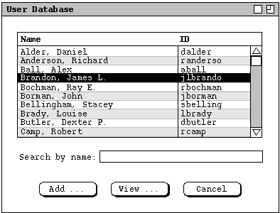 The dialog contains all of the information in a user record. The `Name' is entered separately as `last', `first', and `middle'. Only `last' is required. If `middle' is non-empty, `first' must be non-empty. The names appearing in the database list of Figure 201 are formatted as follows: