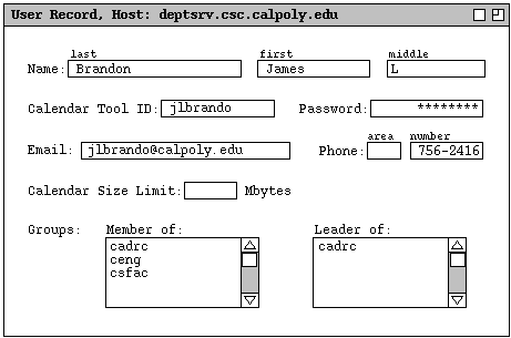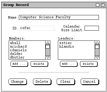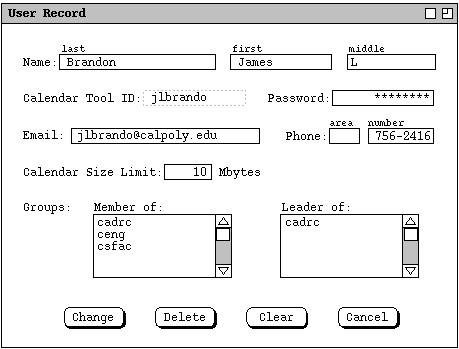 The user record dialog has all of the data fields present in the add-user dialog. In addition, there are two scrollable lists that show the Calendar Tool groups of which the user is a member and a leader. The administrator can change all data fields except `Calendar Tool ID', `Member of', and `Leader of'. Once an ID is assigned for a particular user, it cannot be changed. Group membership and leadership are changed with the group database commands described in Section 2.6.3.