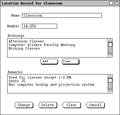 Normally in Calendar Tool display windows, uneditable data fields are shown in light-grey typeface and borders. This is not the case with the regular-user database displays, since none of the fields is ever editable, and they appear more readable in regular type and black borders.